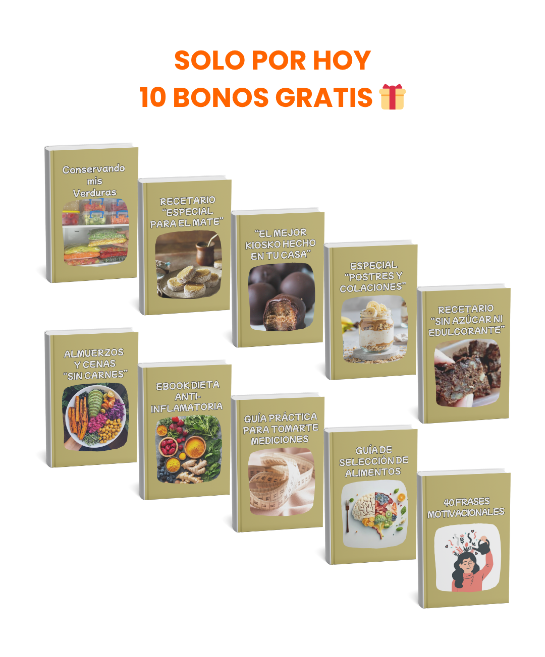 - 10 bonos exclusivos que complementan la guía para transformar tu alimentación sin complicaciones.